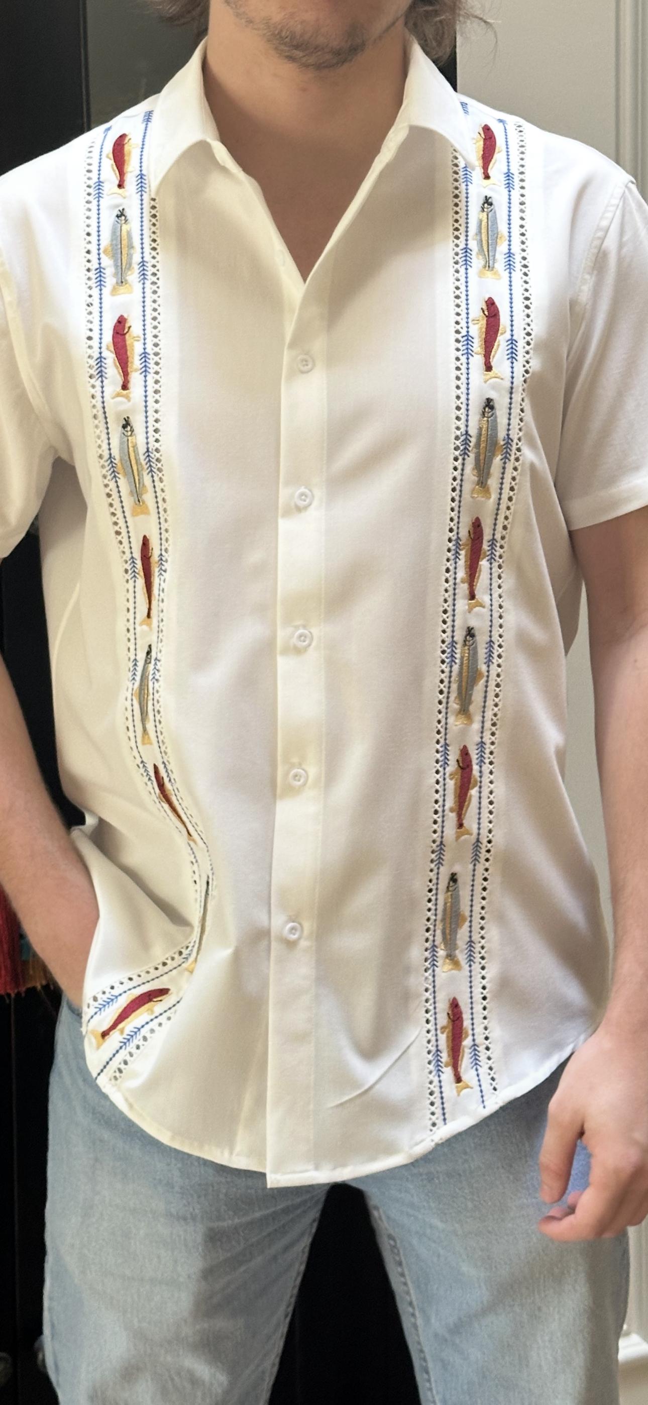 This Gulf Coast Guayabera is where laid-back fishing days meet timeless Southern charm. Embroidered with redfish and trout running down each side, this crisp white shirt honors the coastal lifestyle in classic form. Whether you’re at the marina, a fish fry, or Sunday brunch, this cotton-linen guayabera keeps you cool while making a statement. Breezy, breathable, and made for anglers who know style.